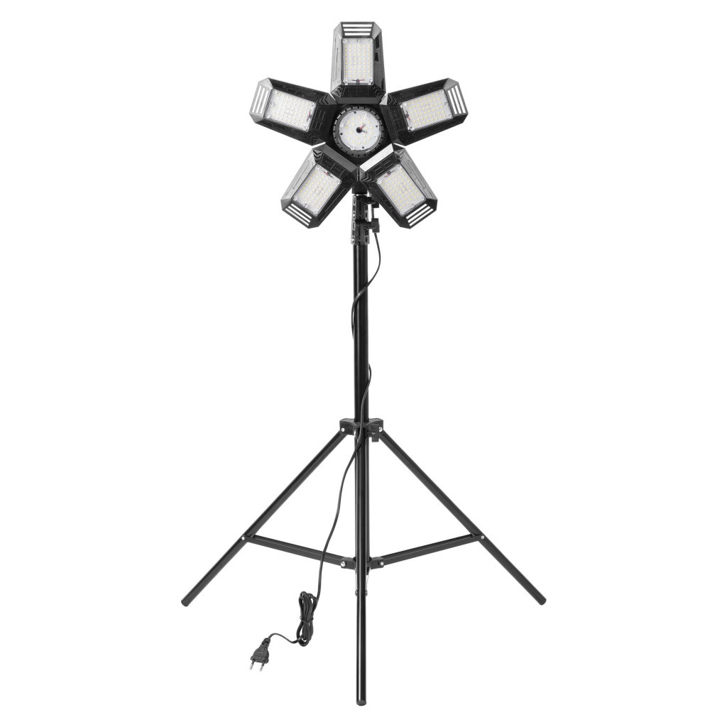 Az összecsukható munkalámpa 6 LED-es fényforrással van felszerelve - 5 állítható oldalsó szárny és egy kerek LED-panel (rögzített) középen - amelyek erős fényáramot 4950lumen és 6500 K színhőmérsékletet generálnak.