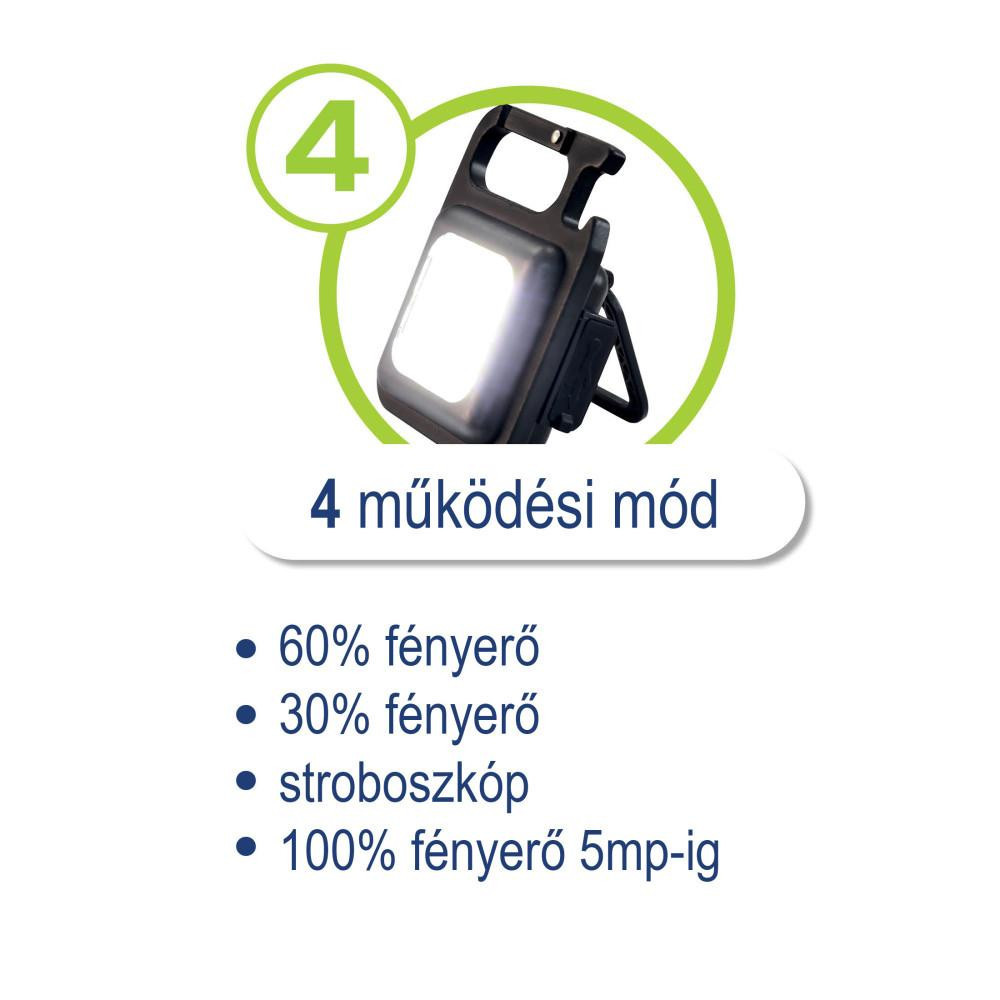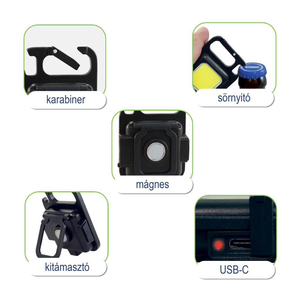 4 mód (30%-os fényerő, 60%-os fényerő, villogó, 5 másodpercig tartva a 100%-os fényerő), mágneses tartó, mini állvány, sörnyitó, karabiner, USB-C port)) különlegessé teszik ezt a kis LED-es zseblámpát!