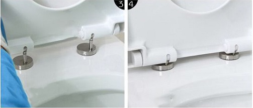 | Nyomd le egy időben a jobb és bal oldali gombot az ülőkén. Igazítsd a két csatlakozót egyszerre a megfelelő helyre majd nyomd le az ülőkét. | Rögzítsd a wc ülőkét. |