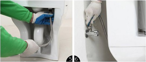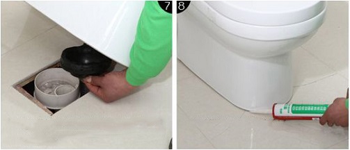 | Alsó kifolyás esetén: csatlakoztasd a bekötő csövet, majd a bekötő csövet csatlakoztasd a szennyvíz elvezetőhöz és óvatosan helyezd rá a wc-t. | Szilikon gél segítségével töltsd ki a hézagot a wc csésze és a csempe között. Ezzel a telepítés befejeződött. Szilikon gél használata után 24 órát hadjuk száradni! |