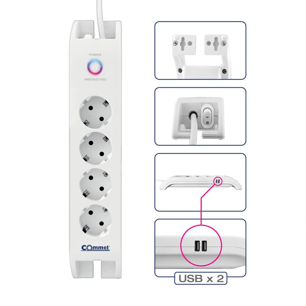 Elosztó, 4 konnektorral és 2 db USB csatlakozóval, túlfeszültség elleni védelemmel