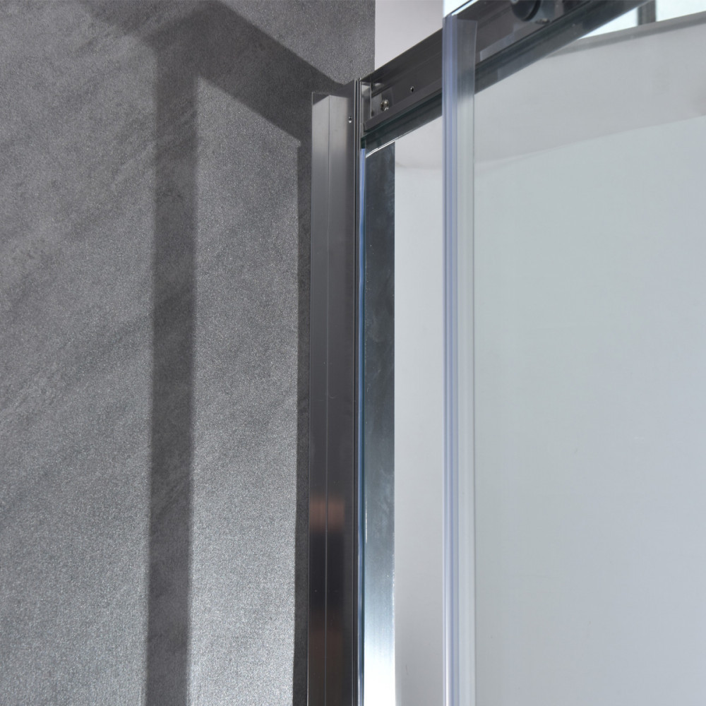 6 mm edzett üveg, krómozott alumínium profilok, felső és alsó dupla görgős ajtónyitó rendszer easy clean funkcióval, cink ötvözet ajtónyitó gomb, profil állítási lehetőség 15 mm mindkét oldalon