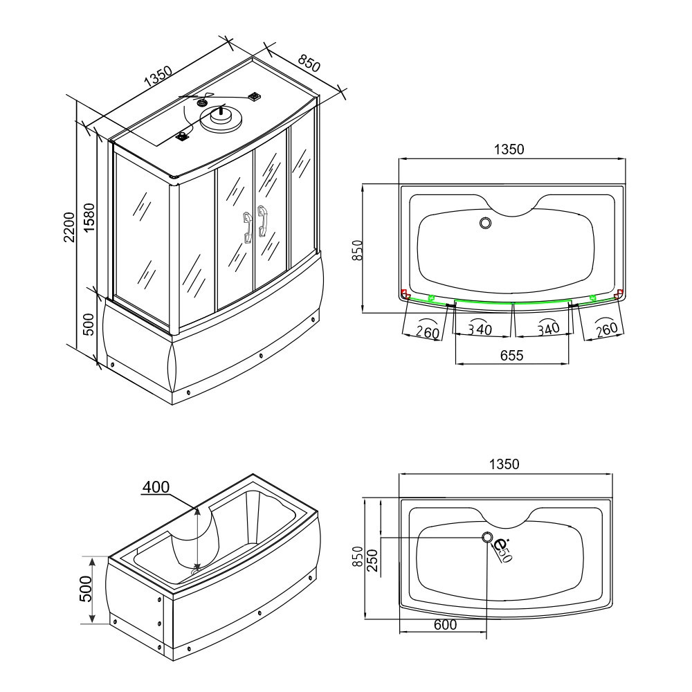 A kabint 5 mm vastag edzett biztonsági üveg veszi körül, amely sötétszürke fix üveg- és ajtópanelekkel, illetve fekete üvegfalakkal fokozza az esztétikai megjelenést. A matt króm vezetősínek és profilok tovább emelik a termék eleganciáját, míg a matt króm funkciópanel a vezérlési lehetőségek középpontjában áll. A kabin 6 hidromasszázs fúvókával rendelkezik, amely garantálja az egész testet átölelő masszázsélményt, miközben a beépített rádió, ventilátor, LED háttérvilágítás és felső világítás tovább fokozza a relaxáció élményét.