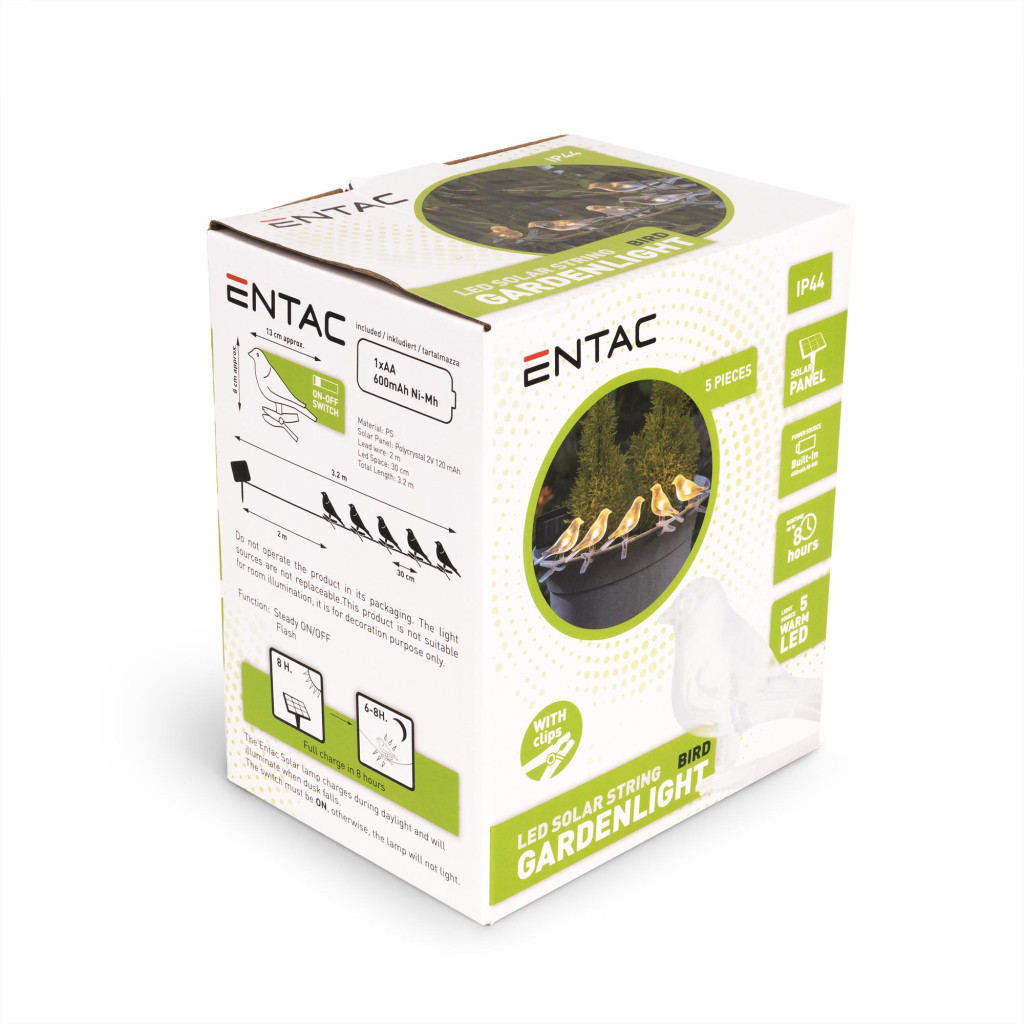 Entac Kerti Szolár Lámpa, Madár alakú, 1.5m LED zsinór, 5db WW LED