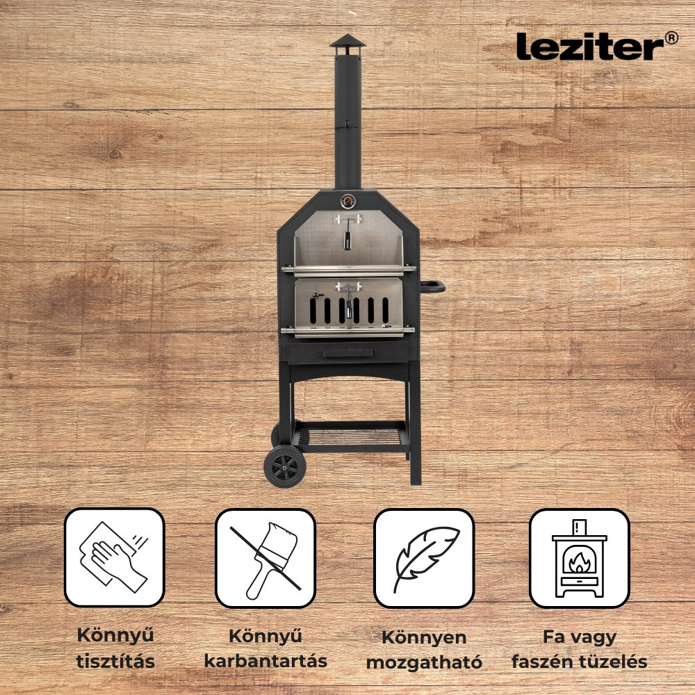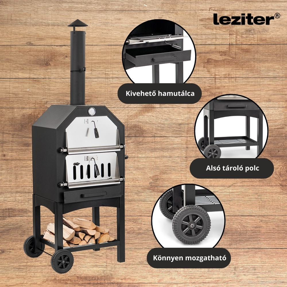 Tűzifa vagy faszén tüzelés – hagyományos, füstös aromákhoz Beépített hőmérő – a stabil, ellenőrzött sütési hőfokért Kivehető hamutálca – könnyű tisztításhoz Masszív, porszórt acéltest – hosszú távú használatra Mozgatható kialakítás – kerekekkel és fogantyúval Pizzakő – az autentikus állag eléréséhez Pizzalapát – a biztonságos és egyszerű kezeléshez Takaró – védelem az időjárás viszontagságaitól Több mint pizzakemence – igazi kültéri konyhai mindenes