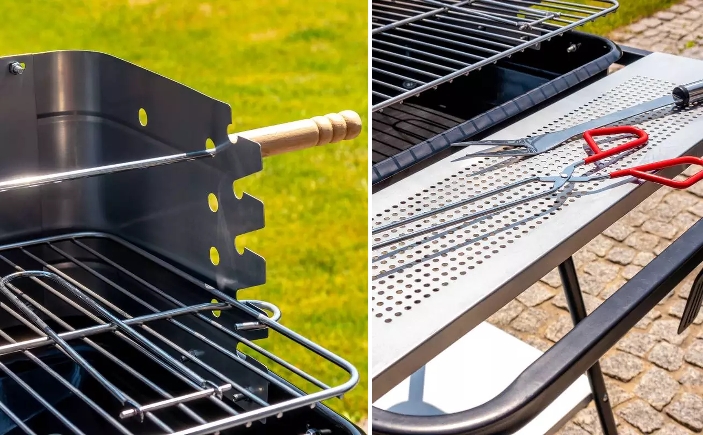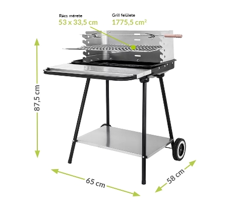 A széngrill képes beállítani a rostély magasságát, amely lehetővé teszi az ételek elkészítésének ellenőrzését és tökéletes elkészítését. Funkcionális előny az alsó és az első polc, amelyek megkönnyítik a grillezést és a praktikus kiegészítők tárolását.