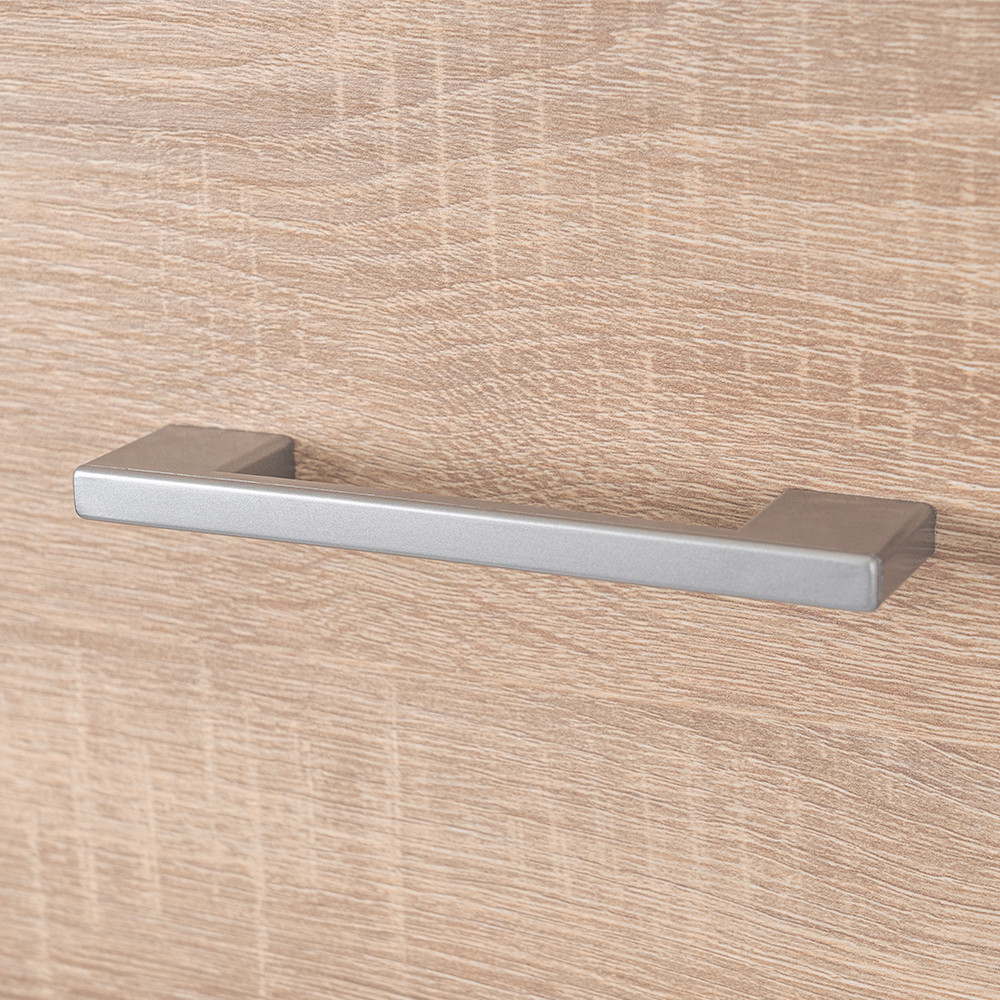A Miami komód sonoma tölgy fronttal és a sonoma tölgy korpusszal letisztultságot és eleganciát kölcsönöz a térnek, miközben a minőségi bútorlap anyaga garantálja a tartósságot és az ellenálló képességet. Méretei - 40 cm mélység, 80 cm szélesség, 92 cm magasság - ideálisak bármely helyiségbe. A komód két szárnyú nyílóajtaja mögött 3 polc található, amelyek tökéletesen alkalmasak ruhák, könyvek vagy akár irodai felszerelések tárolására. A modern dizájnt matt króm hatású műanyag fogantyúk egészítik ki, amelyek még letisztultabbá teszik a megjelenést.
