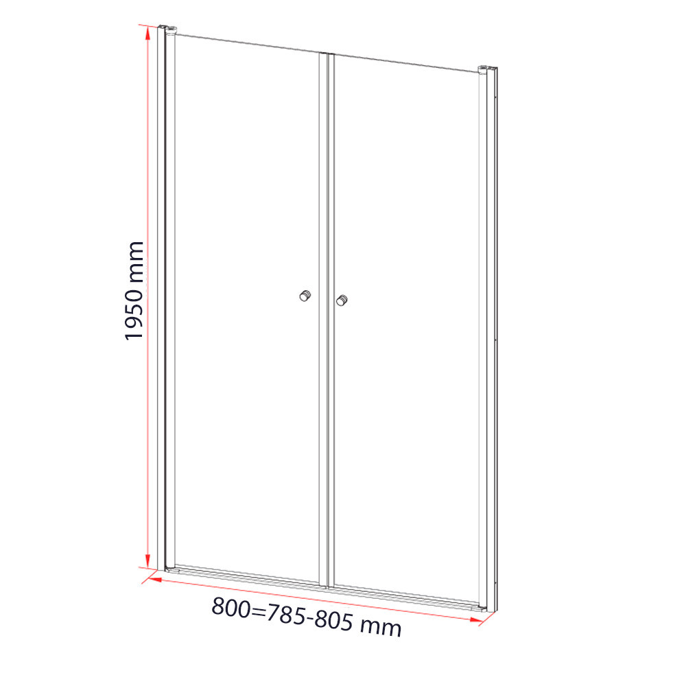 A zuhanyajtó Alumínium ötvözet polírozott profillal, 5 mm-es víztiszta edzett biztonsági üveggel és cink fogantyúval van ellátva. A modell 800 x 1950 mm méretű, és 785-805 mm között állíható.