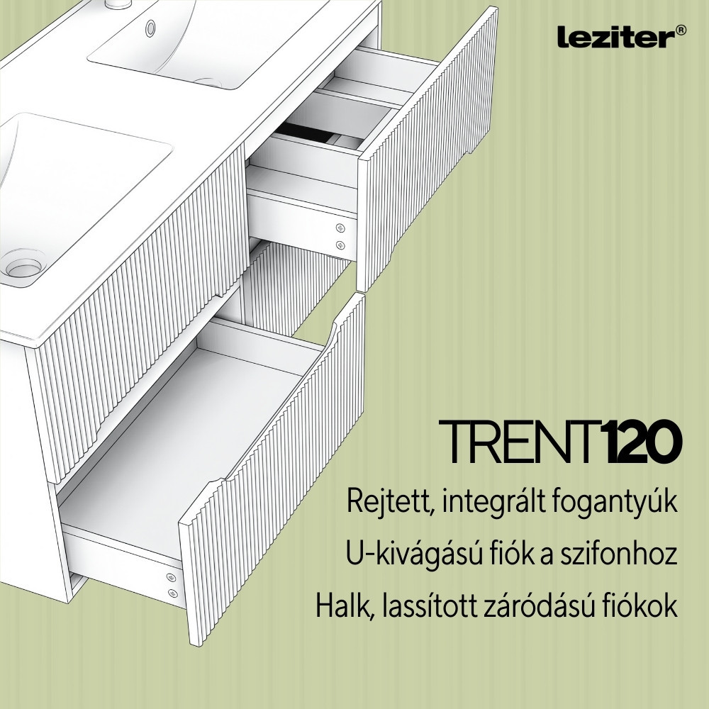 A Leziter Trent fürdőszobabútor méretét tekintve könnyen elhelyezhető. Az ajtó 18 mm vastag MDF-ből készül, PVC fóliás felülettel, míg a korpusz 15 mm-es MDF alapra épül, tartós melamin bevonattal.