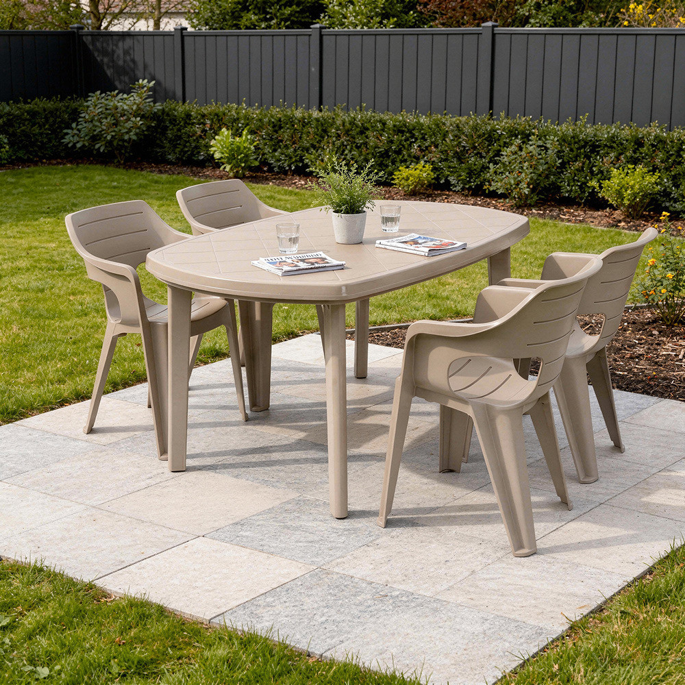 A Lino 4+1 kerti bútor garnitúra szett cappuccino színben remek választás kisebb kültéri terekhez, ha kényelmes és könnyen karbantartható étkezőszettet keresel.