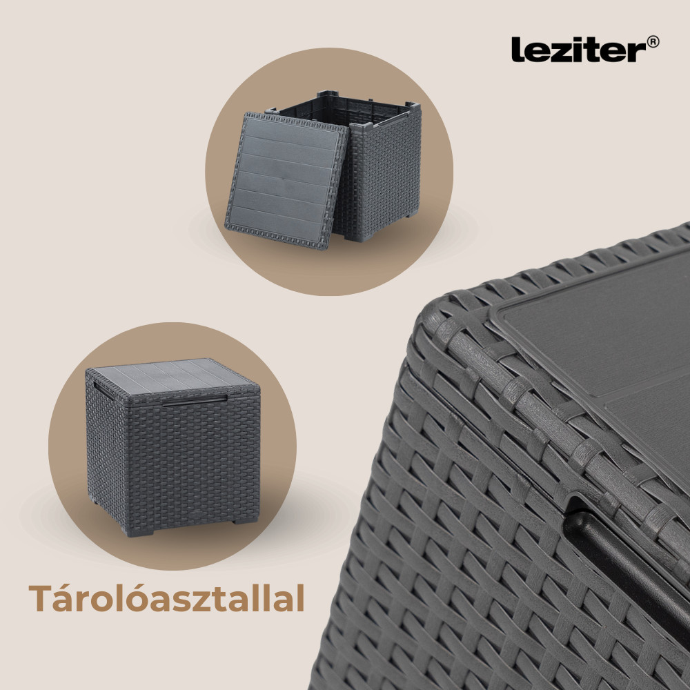 Ez a Grafit színű rattan hatású kerti bútor szett két fotellel, egy 6 személyes sarokkanapéval és egy tárolós asztallal rendelkezik, amelyeket időjárásálló műanyagból készítettek, így nem kell aggódnod a UV sugárzás hatásaitól sem. A fotel magassága: 74 cm, szélessége: 63 cm, hossza: 65 cm. A fotel és a kanapé párnával rendelkezik, mely kényelmessé teszi és színben passzol a bútorhoz. Az asztal magassága: 37 cm, szélessége: 37 cm, hossza: 37. Az asztal több funkciós, így a tároló részében elrejtheted a kerti eszközöket.
