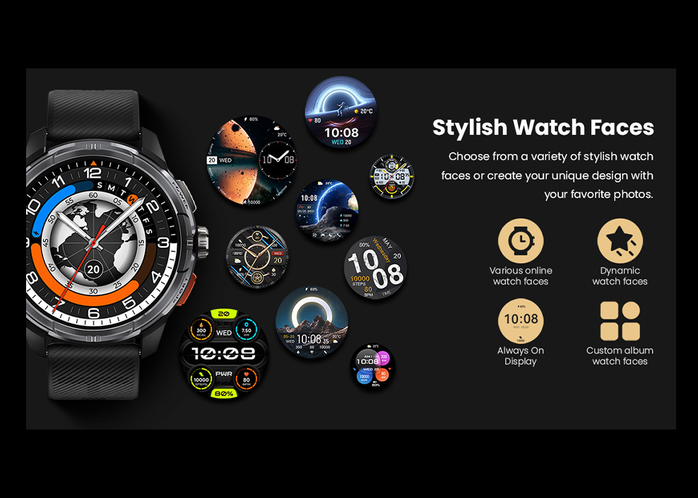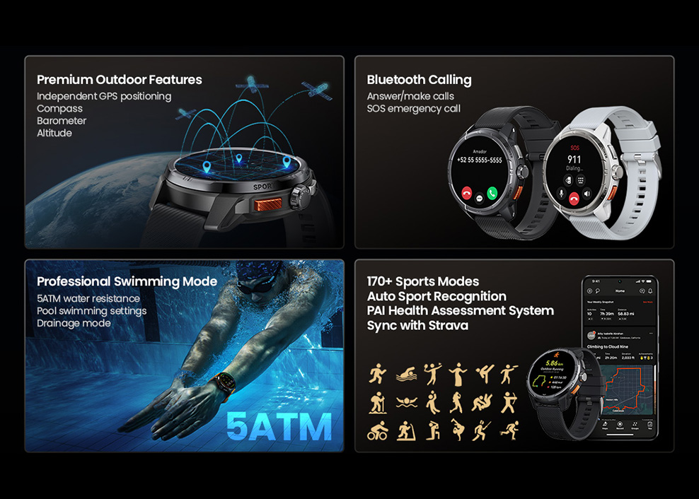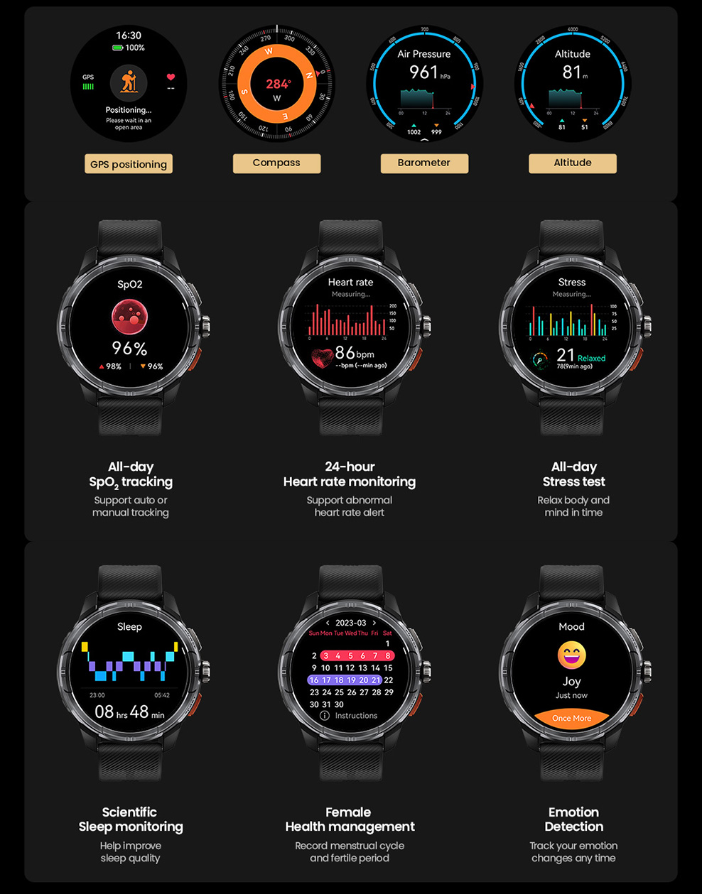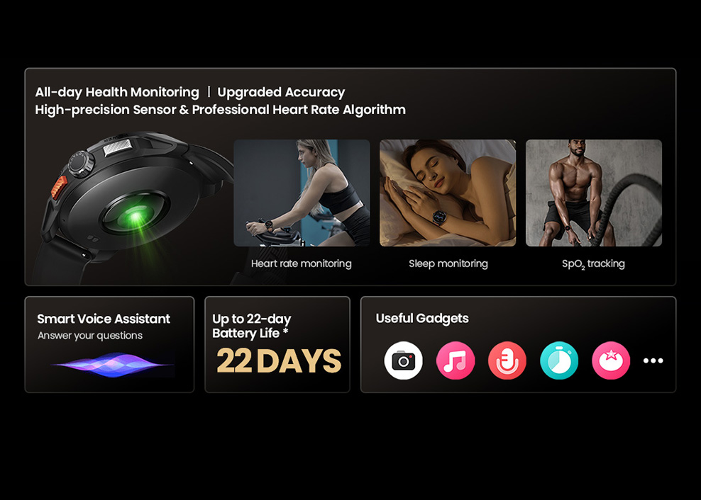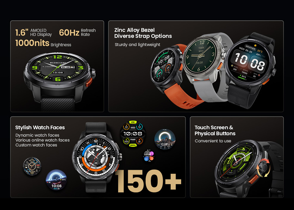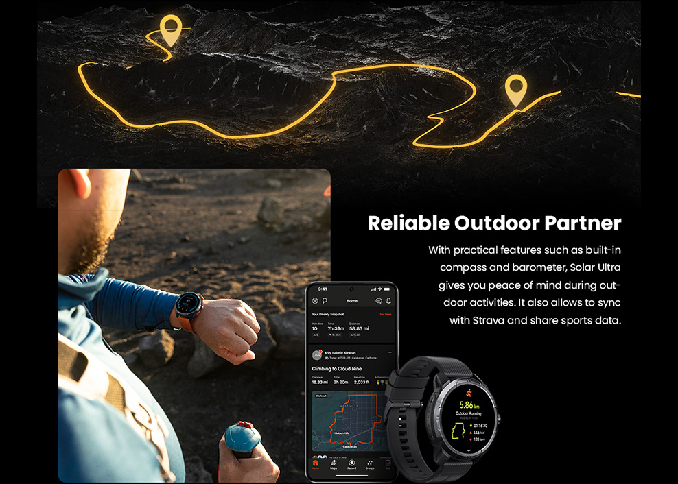Die Haylou Solar Ultra LS23 bietet ein hochwertiges Design mit 1,6″‑AMOLED‑Display (480×480 px), 60‑Hz‑Bildwiederholrate und 1000 Nits Helligkeit für sehr gute Ablesbarkeit auch in der Sonne. Das Metallgehäuse mit wechselbaren Armbändern sorgt für einen eleganten, langlebigen Look. Je nach Modus hält der Akku ca. 12–22 Tage, mit GPS‑Nutzung bis zu 32 Stunden. 5‑ATM‑Wasserschutz, 170+ Sportmodi, Herzfrequenz‑, SpO₂‑, Schlaf‑ und Stressmessung, VO₂ max, Barometer, Kompass, Anruf‑ und Musiksteuerung sind integriert.