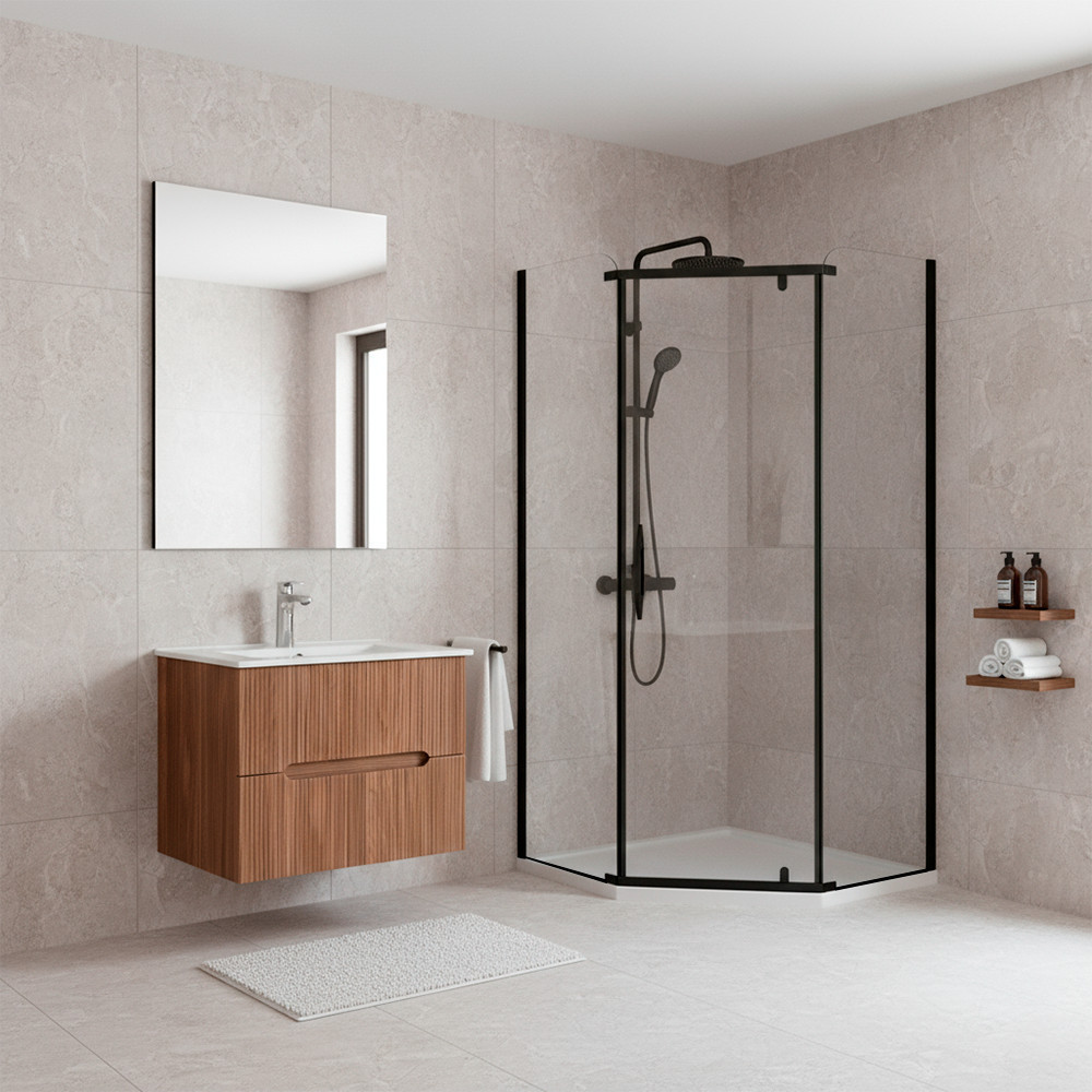 A Leziter Celtic 100×100 cm-es zuhanykabin jól illeszkedik a modern fürdőszobai környezethez. Letisztult, ötszögletű formája harmonikusan illik a legtöbb burkolathoz és szaniterhez.