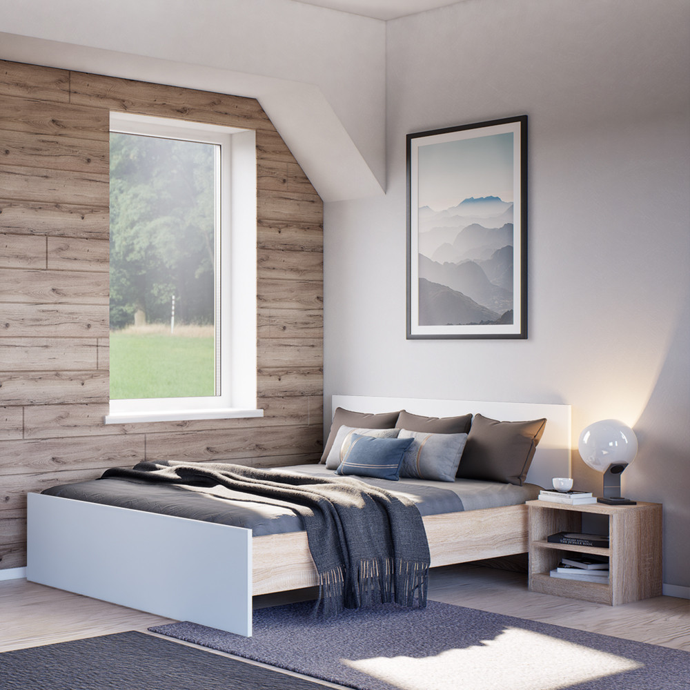 | Anyag | Kiváló minőségű bútorlap, sonoma tölgy, fehér fejvéggel és ágyvéggel. |