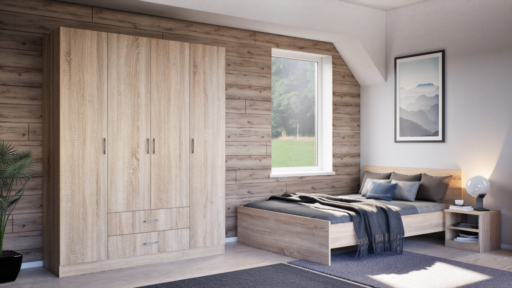 | Anyag | Kiváló minőségű bútorlap, sonoma tölgy oldallappal, sonoma tölgy fejvéggel és ágyvéggel. |