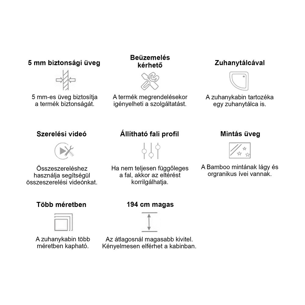 - Magasság: 180 cm (kabin), 194 cm zuhanytálcával együtt