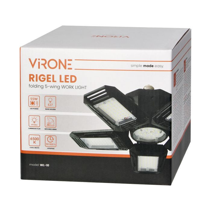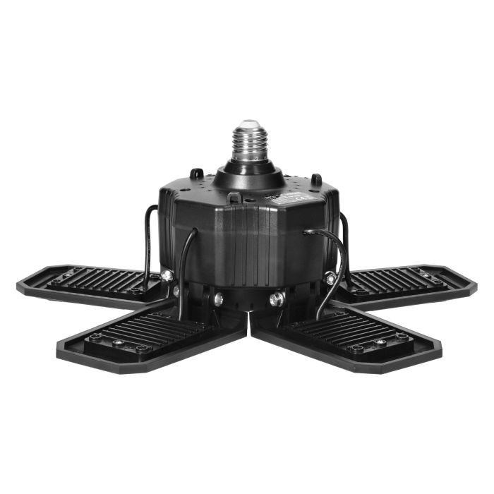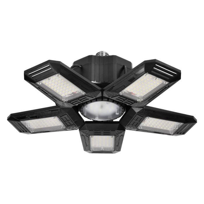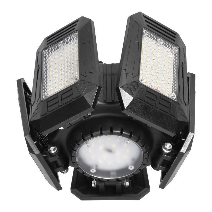 Az összecsukható munkalámpa 6 LED-es fényforrással van felszerelve - 5 állítható oldalsó szárny és egy kerek LED-panel (rögzített) középen - amelyek erős fényáramot 4950lumen és 6500 K színhőmérsékletet generálnak.